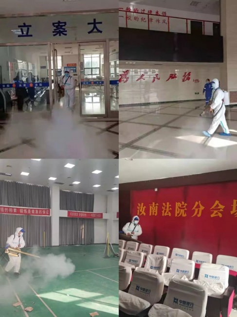 蛟龙救援队的志愿者们身穿防护服,佩戴橡胶手套、口罩等防护用品,背负数十斤的消毒液,手持脉冲弥雾机,在汝南法院后勤服务中心的协助下,对诉讼服务大厅、餐厅、审判庭、楼层通道、会议室、卫生间等进行了全面消杀。消毒过程中,参与人员分工合作、操作规范,做到不留死角、全面彻底。此次消杀活动为汝南法院安全有序的开展审判、执行等各项工作提供了健康保障。