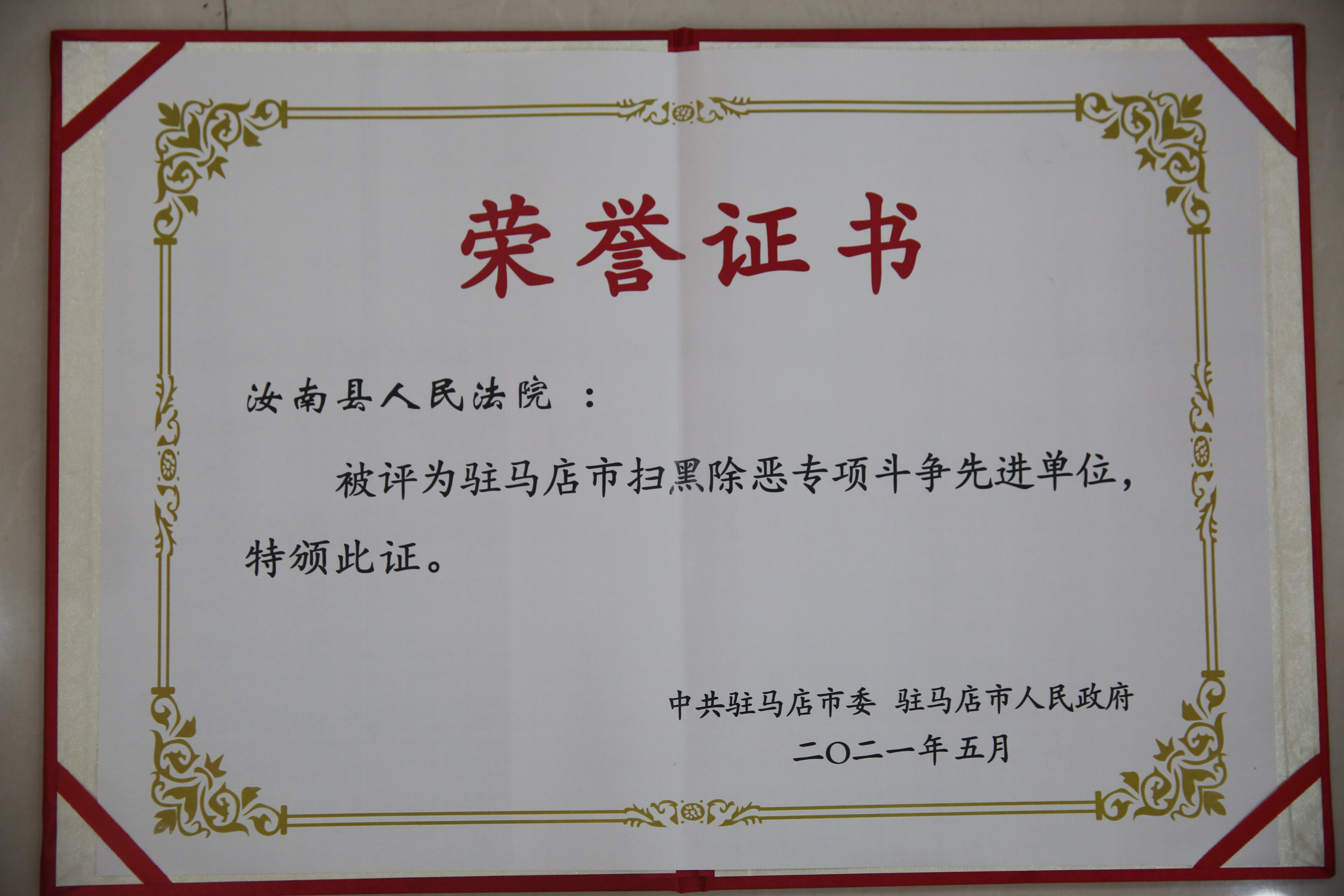 汝南县人民法院被评为驻马店市扫黑除恶专项斗争先进单位
