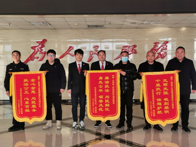 2024年1月4日,寒风料峭,汝南县法院立案服务接待大厅却热闹非凡,某商砼公司经理赵某一行带着三面金灿灿的锦旗,向该院执行干警高效动作,千里奔袭擒拿老赖表示感谢。